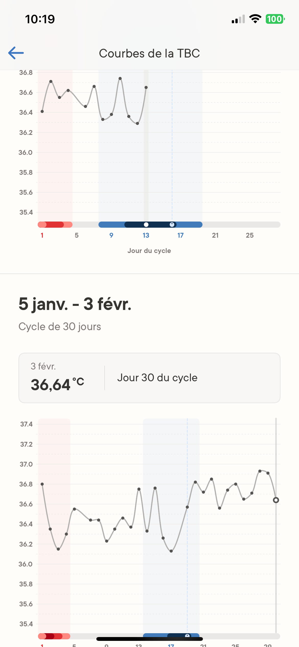 Je prends ma température chaque matin au réveil (buccale) et voici à quoi ressemblent mes courbes à chaque fois. Je peux constater de grosses variations de température pendant la phase folliculaire (j’ovule chaque mois vers J19).