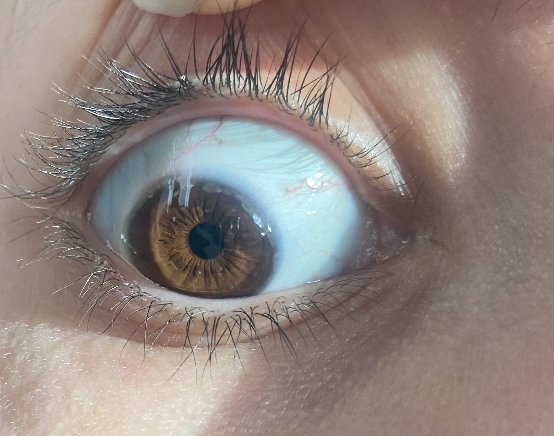 je vous joins des photos de mes yeux, actuellement la crise est tres légère ! Par moment les taches blanches entourent complètement mon iris.