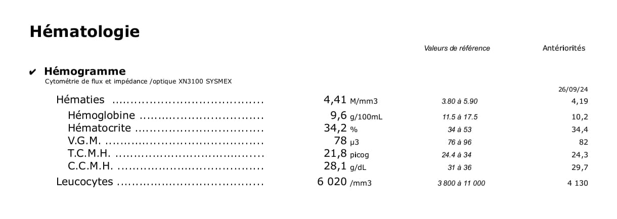 J'ai 30 ans, antécédents cela mes déjà arrivée d'être en anémie , et ont a fait une prise de sang car je me sentais fatigué, énormément essoufflé lors d'effort physique et je n'avais plus de punch lors de mes courses à pied, pas mal de maux de tête, tête qui tourne mouche devant les yeux. Voilà les raison de la prise de sang :)