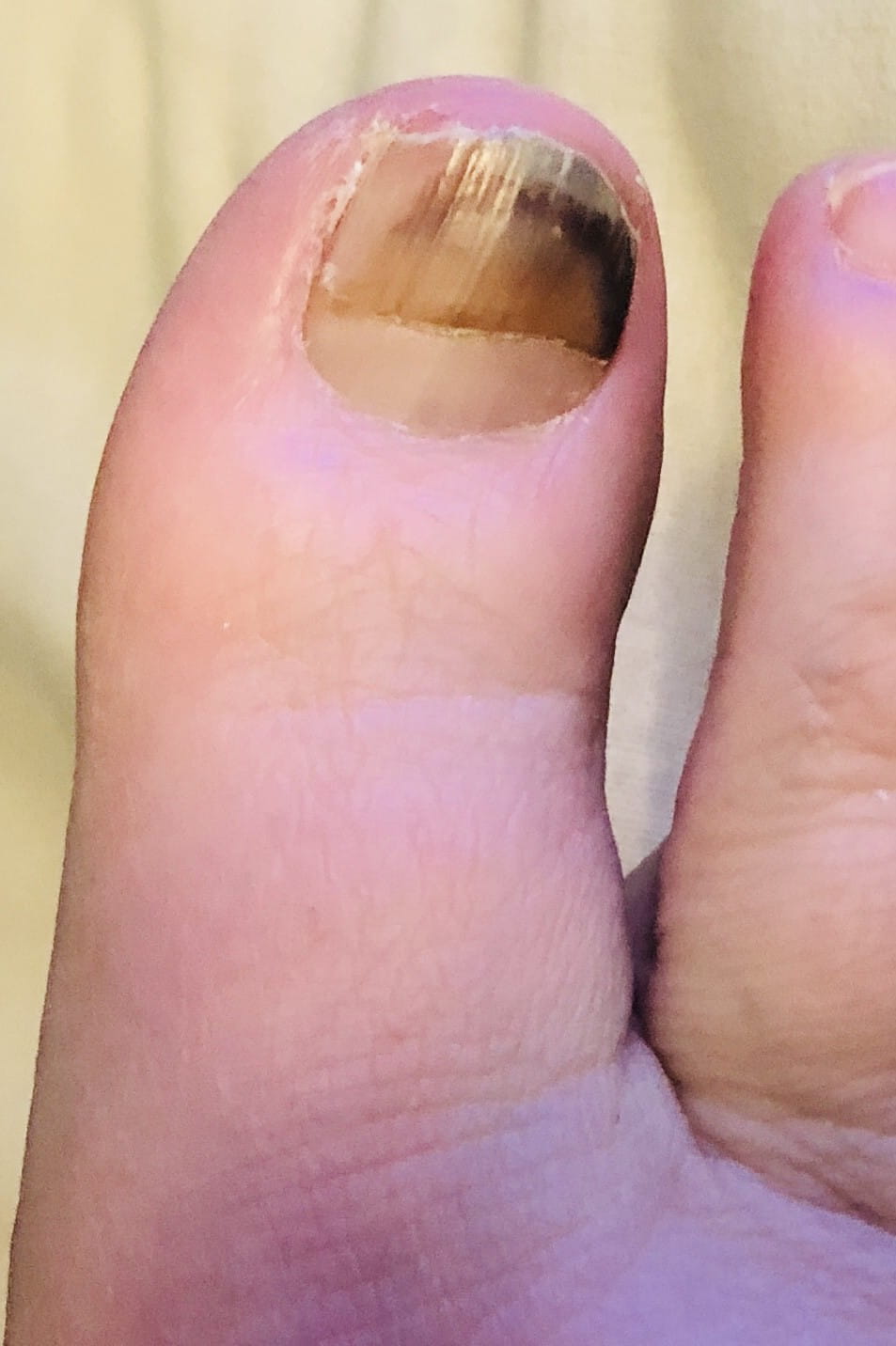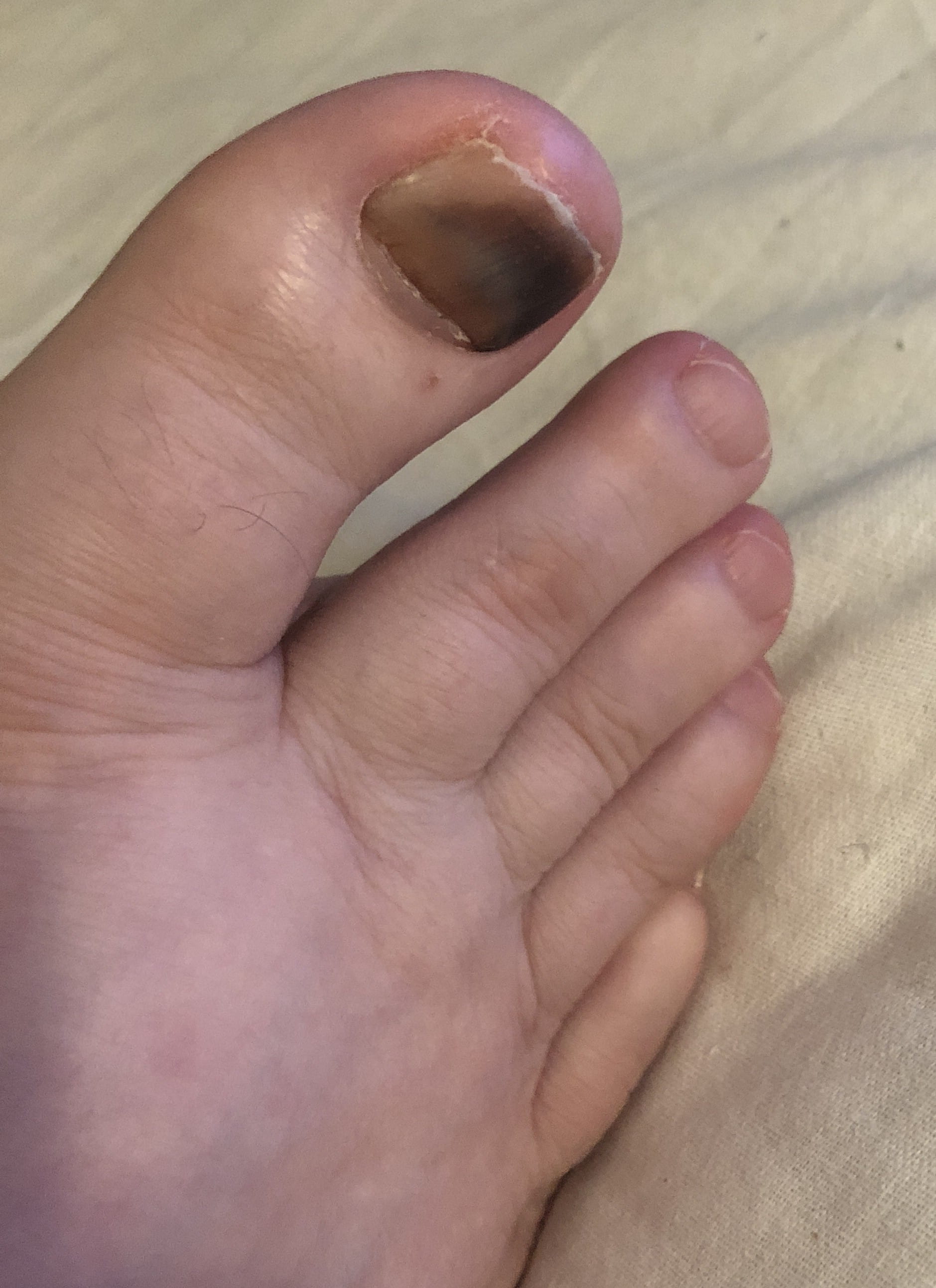 Mais bon, le principal c'est que cet hématome ne porte en rien préjudice à l'ongle lui-même (sauf une repousse potentiellement bosselée) ni à l'orteil.