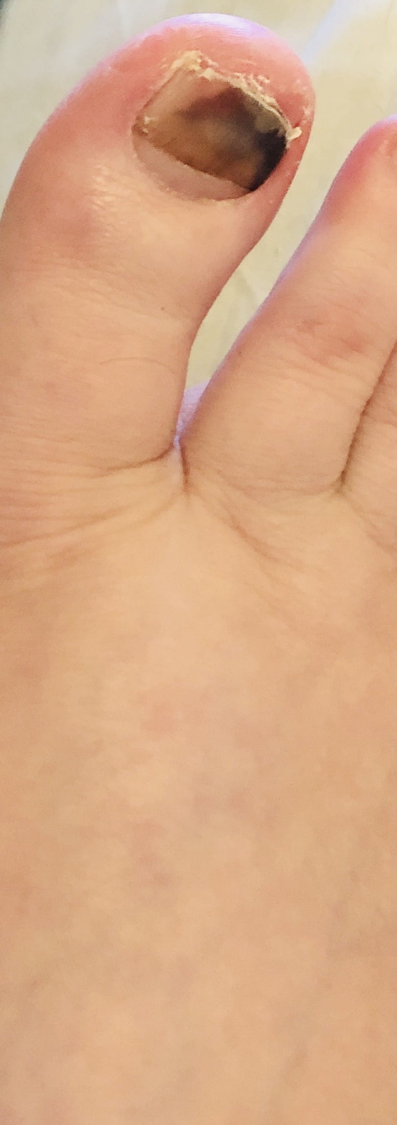 Á ce jour, je souffre encore un peu de tout ça, mais je me pose des questions par rapport à l'ongle de mon gros orteil droit qui est bleu-noir aux 3/4 depuis ma chute (quasi 7 semaines donc).
