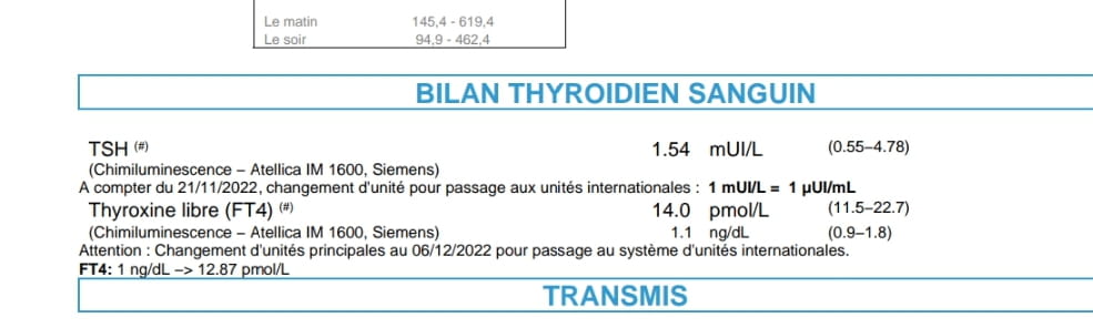 D'autant que j'ai l'impression d'être quand même dans les normes basses. Par exemple pour la T4, je suis à 14 le jour de la prise de sang mais qu'est ce me'dit qui que parfois je bascule pas en dessous de 11 (norme basse)