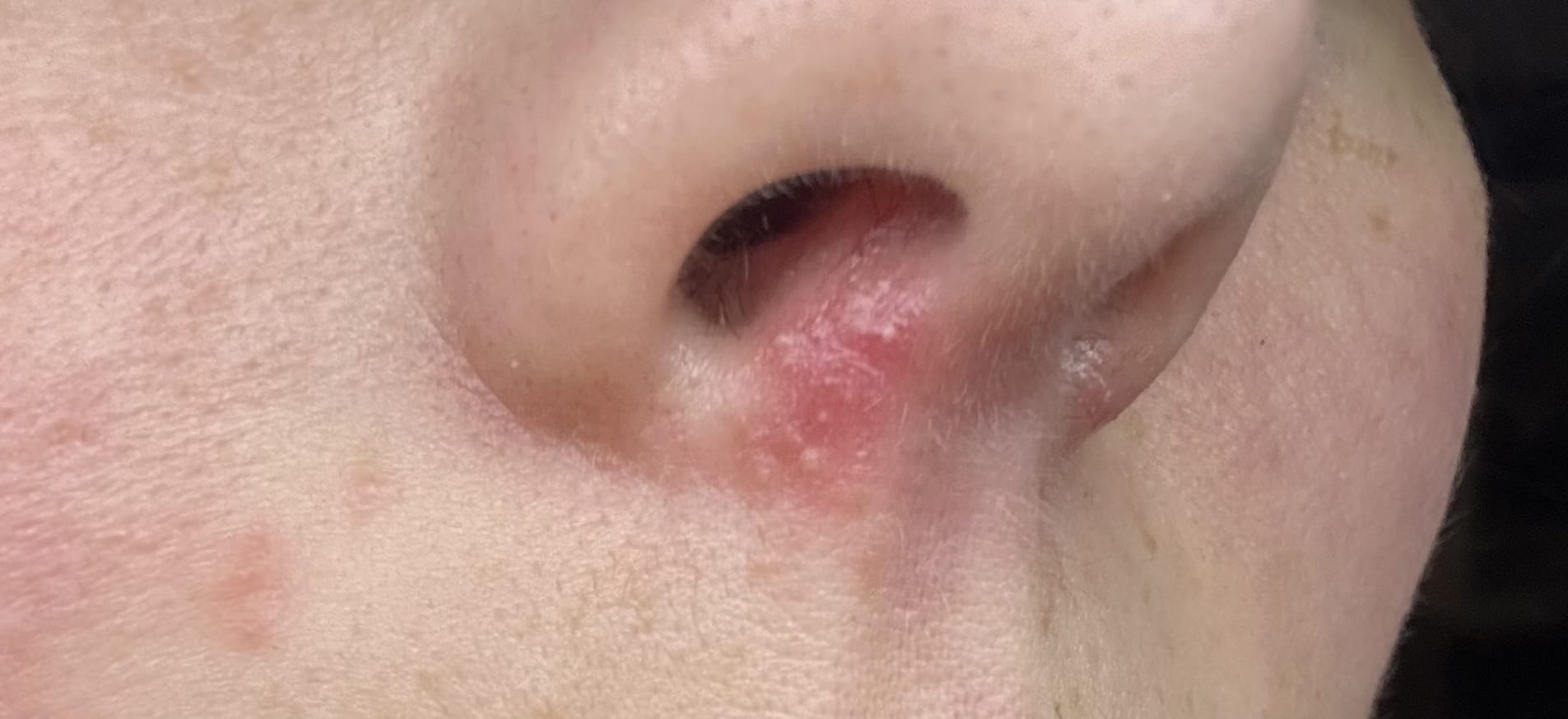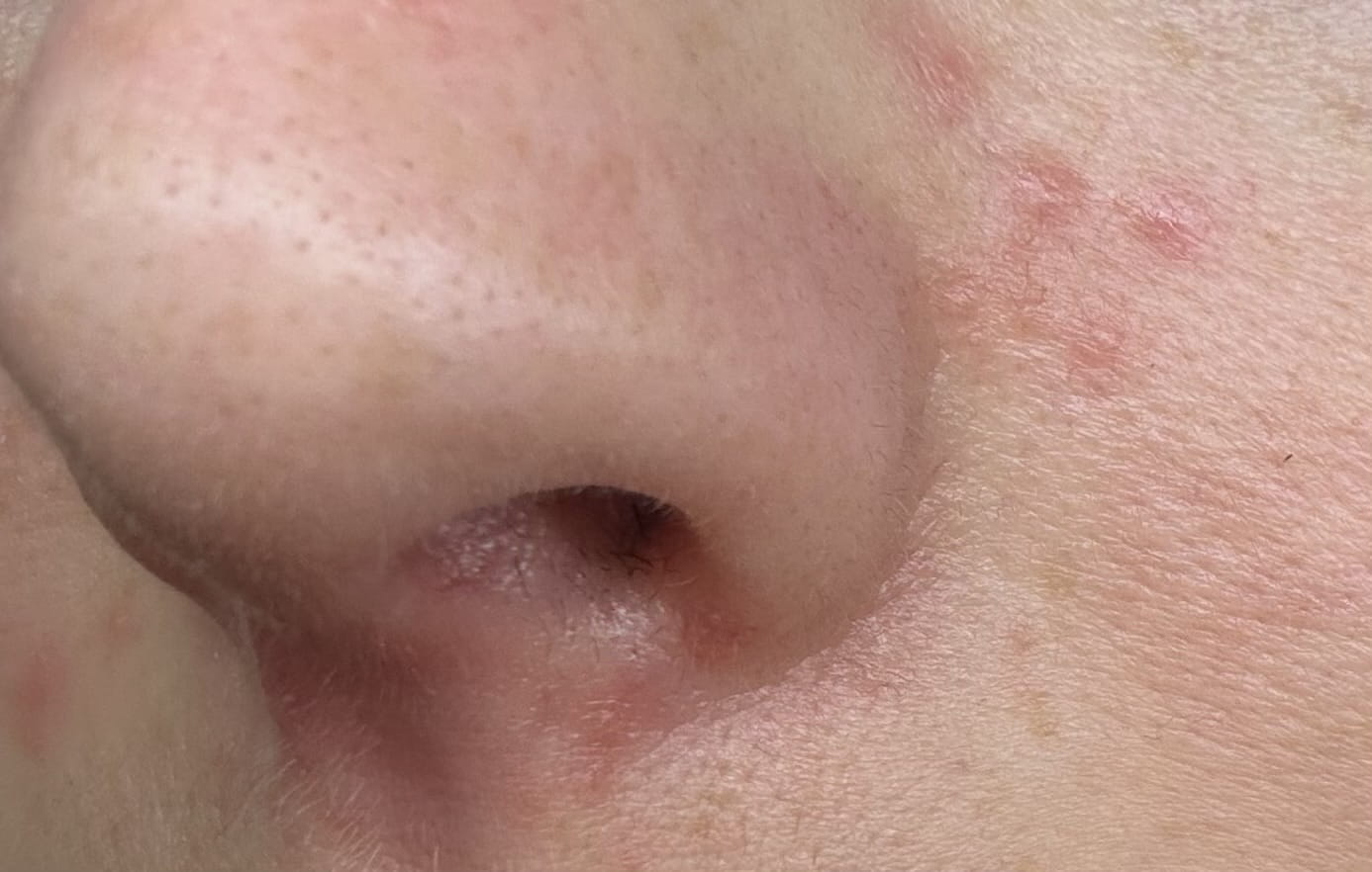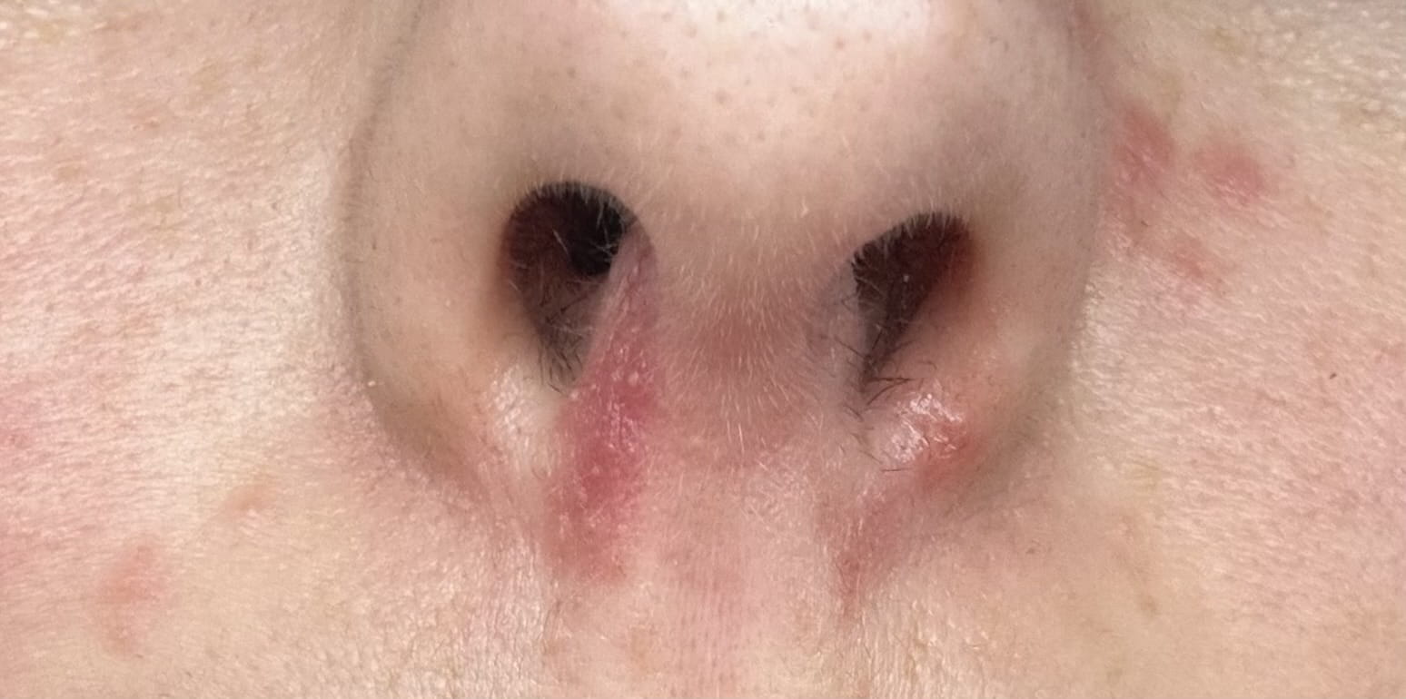 Je me tourne vers vous car je suis un peu perdue face à un problème de peau qui empire. J'ai une plaque rouge très vive située entre les deux narines depuis presque deux mois. Au début j’ai simplement pensé à une irritation suite à un rhume mais ça ne s’améliore pas du tout. Je vous joins plusieurs photos. Ça a commencé uniquement sous le nez entre les deux narines, ensuite ça s’est étendu autour des deux narines et maintenant j’en ai même sur les joues.