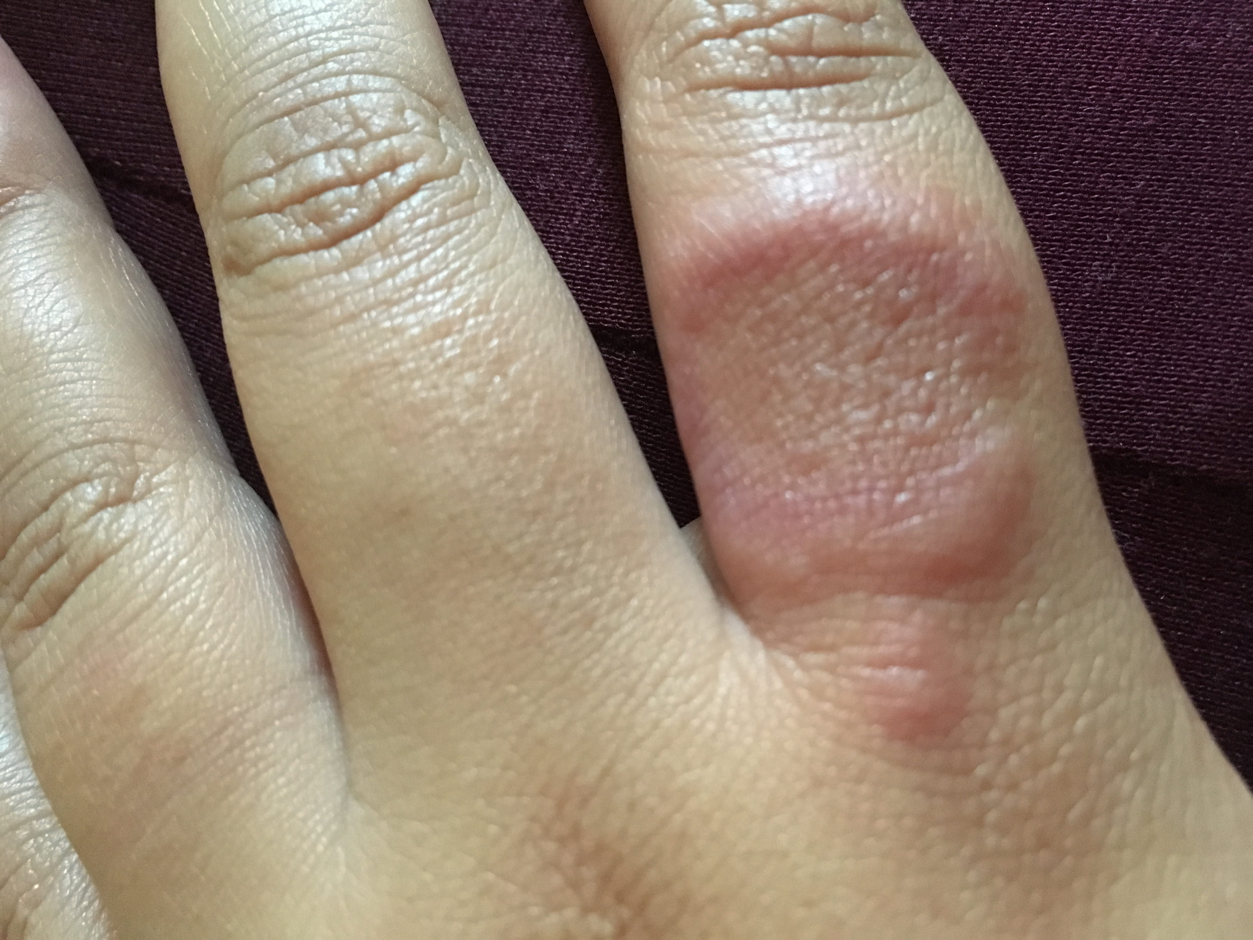 Bonjour je vient vers vous car depuis une semaine j'ai eu une apparition sur mon doigt d'une irruption ronde assez gonflé et qui me démange et grossis je ne sais pas du tout ce que c'est je ne trouve rien apparement ce n'est pas une piqure d'insecte j'ai rdv au médecin la semaine pro en attendant si quelqu'un sait où a déjà eu sa je vous joint une photo