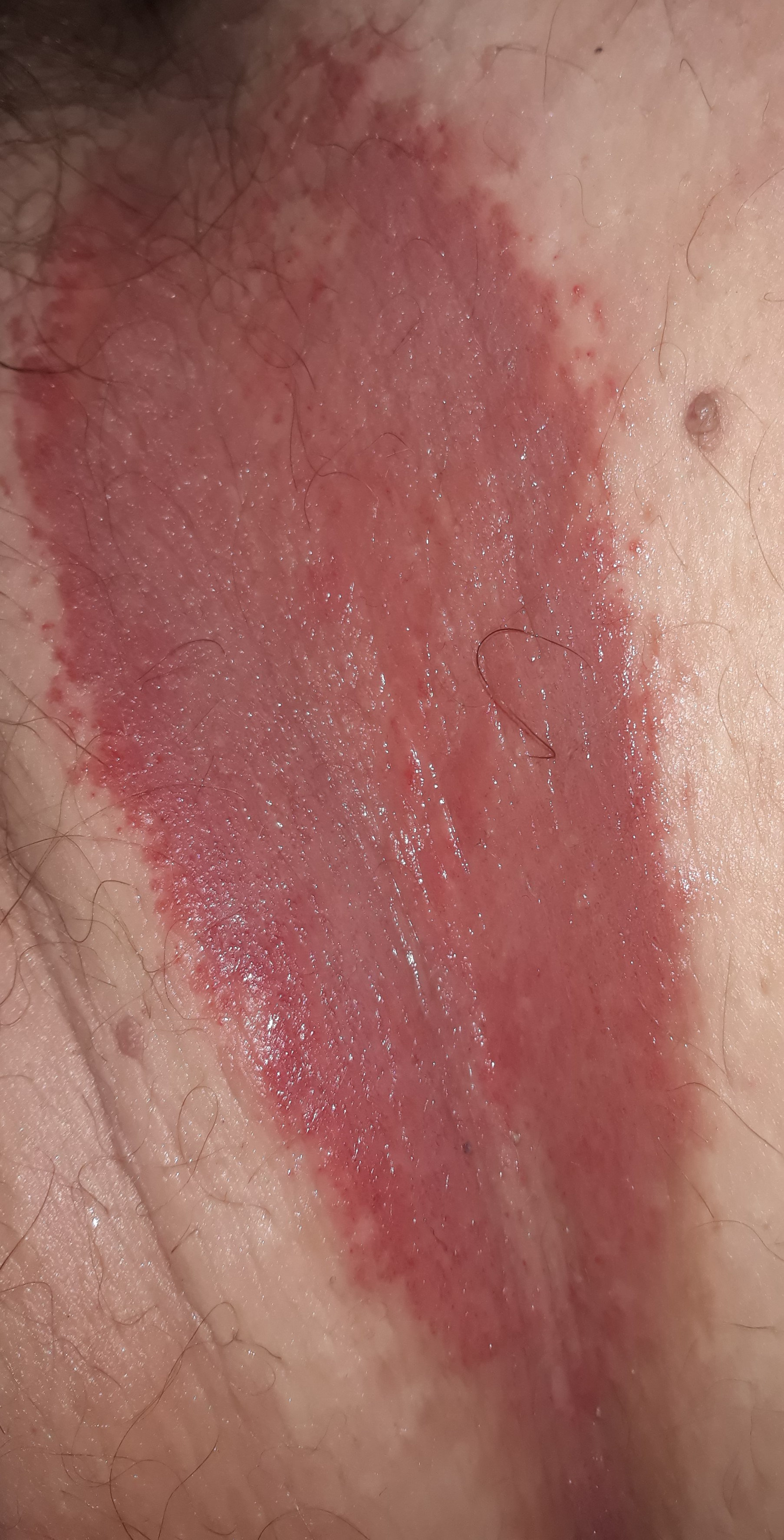 Un ami médecin, à la vue de la photo pense que c'est possiblement un Psoriasis inversé, mais il n'est pas spécialisé en dermatologie et m'a conseillé d'aller voir mon médecin si cela dure, malheureusement celui ci est en vacance et vu que ce n'est visiblement par grave, je ne me suis pas pressé chez son remplaçant.