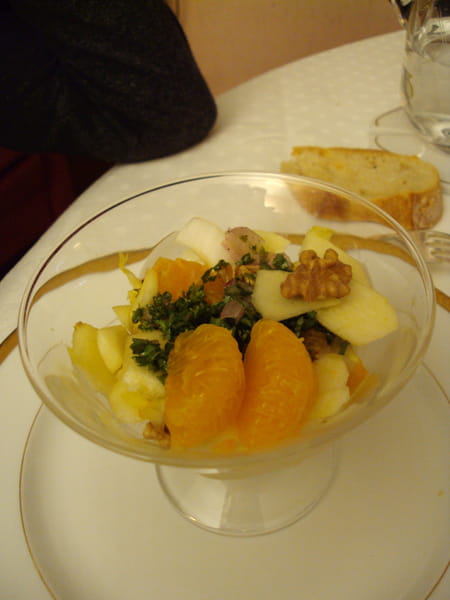Un fond de carottes râpées, quelques feuilles d'endives, quelques tranches de pommes, clémentines, noix, raisins secs etc etc .