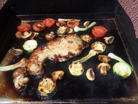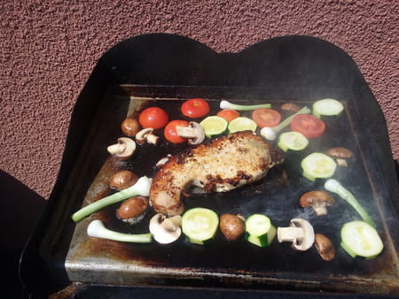 Oignons nouveaux coupés en deux , demies tomates et champignons de Paris frais, une demie courgette tranchée...