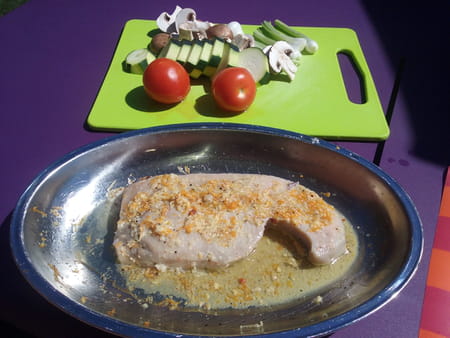 Longe d'espadon marinée dans de l'huile de coco + gingembre rapé + zestes de citron et orange + un soupçon de piment.