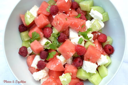 Un régal cette salade de pastèque, framboises, concombre, feta et quelques feuilles de coriandre. C'est devenu un classique, simple et apprécié de tous: