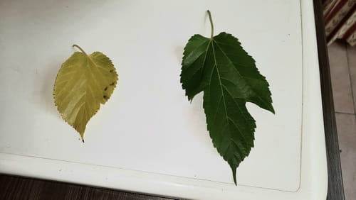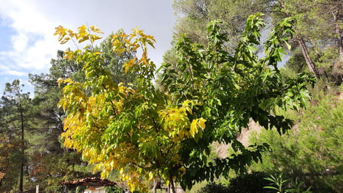 Planté depuis plus de 10 ans, ce murier stérile en bonne santé présente deux feuillages différents, une partie qui jaunit avec l'automne et une partie qui reste bien verte jusqu'aux premiers froids.