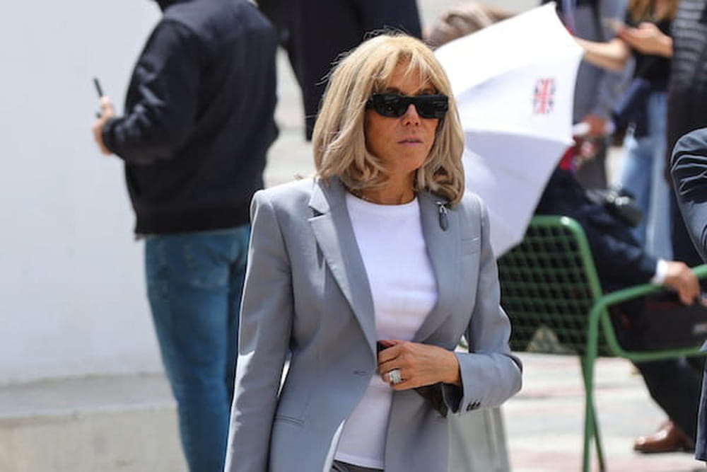 Brigitte Macron, icône de style en tailleur gris et Louis Vuitton