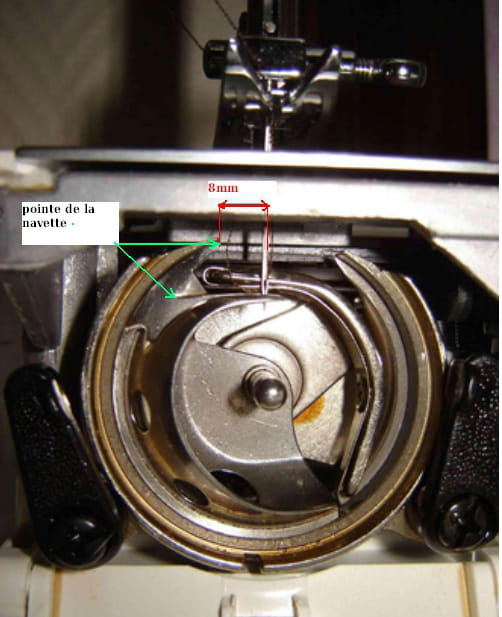 Par ailleurs, la distance entre la pointe de la navette et l'aiguille est chez moi de 5 mm. Si le problème peut venir de là, comment effectuer ce réglage ?