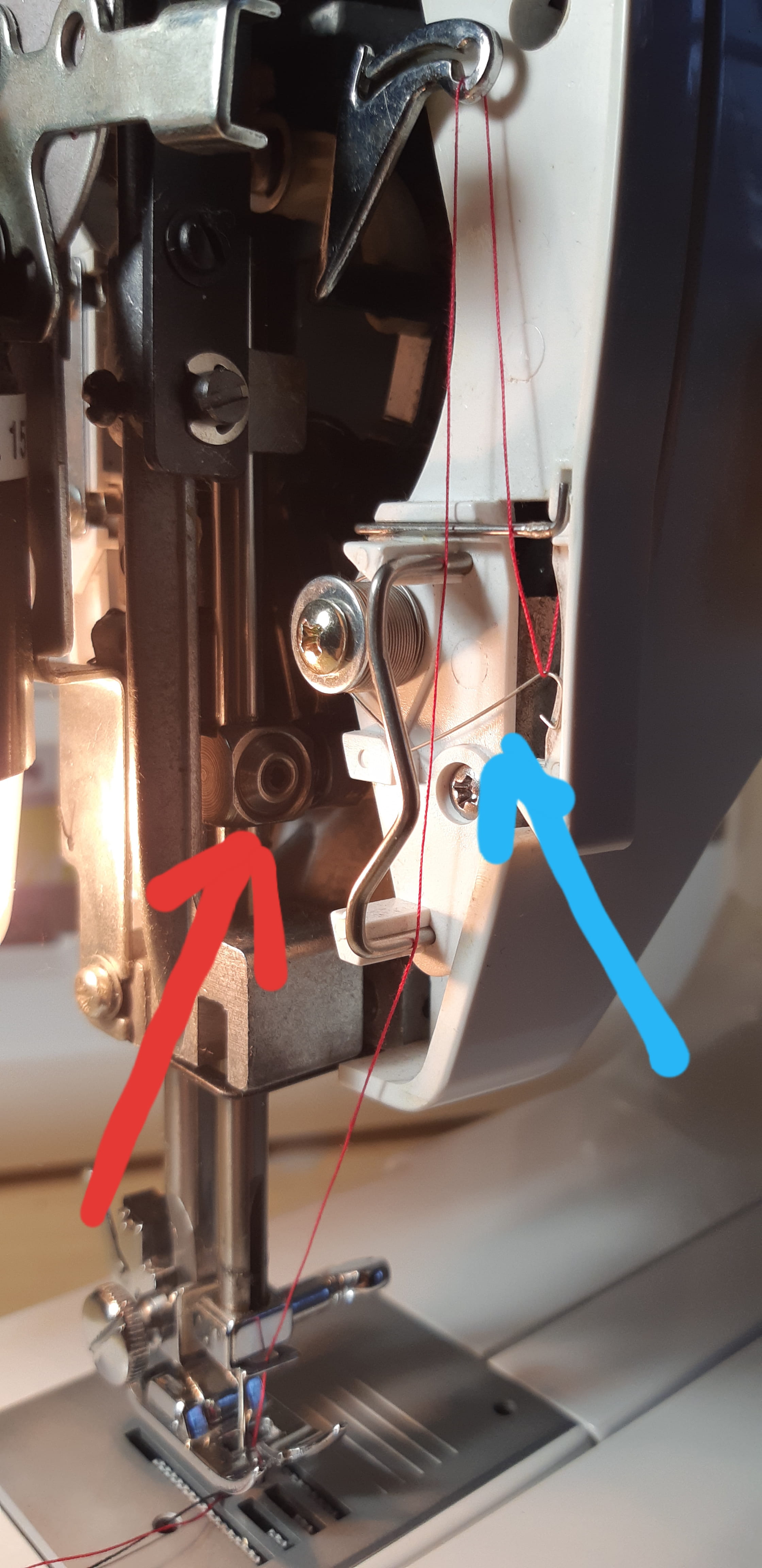 L’aiguille est fixée sur une tige qui s'appelle barre à aiguille. Cette barre est fixée par une bride à mi-hauteur c'est cette bride qu'il faut desserrer et régler à la bonne hauteur.