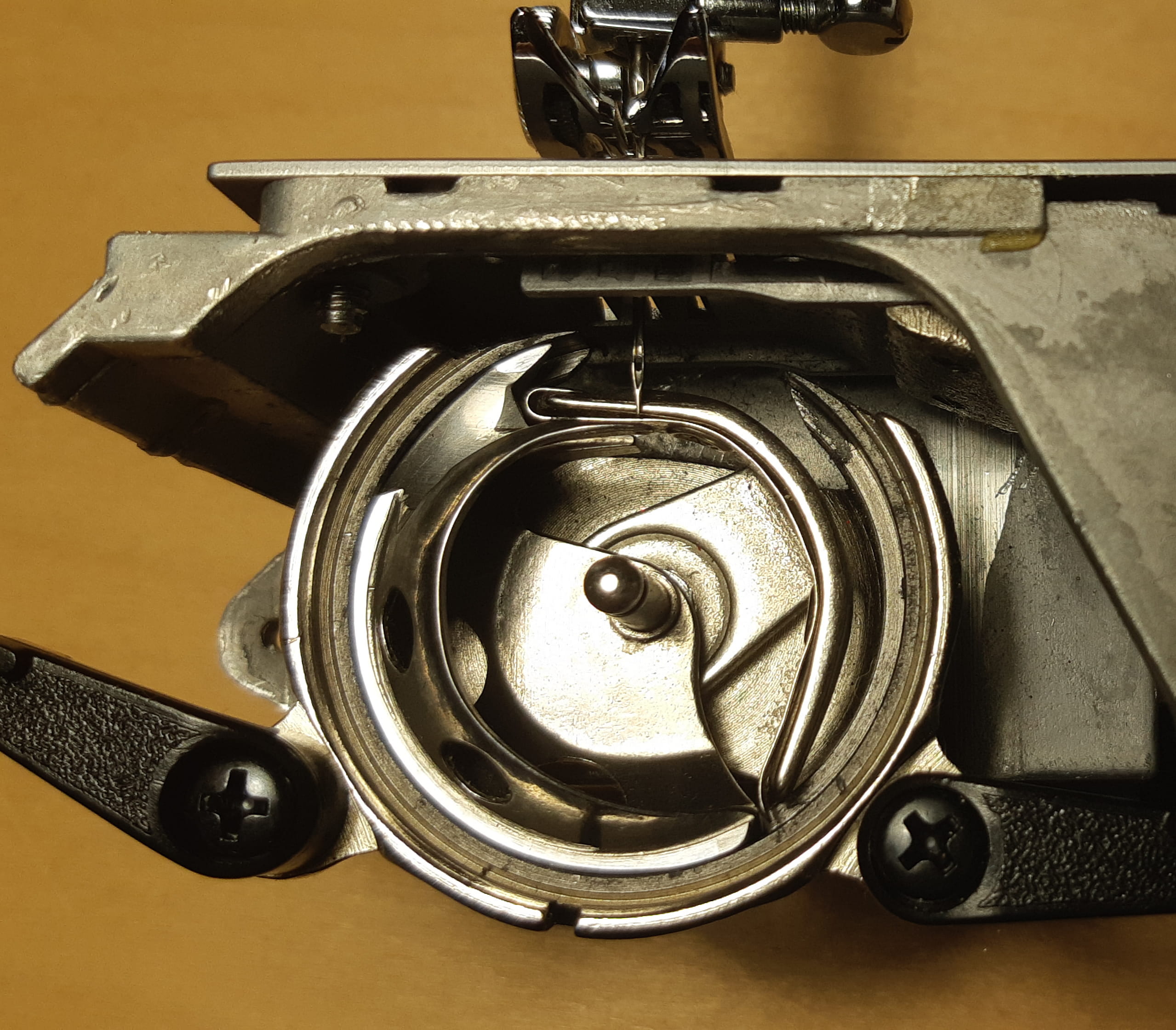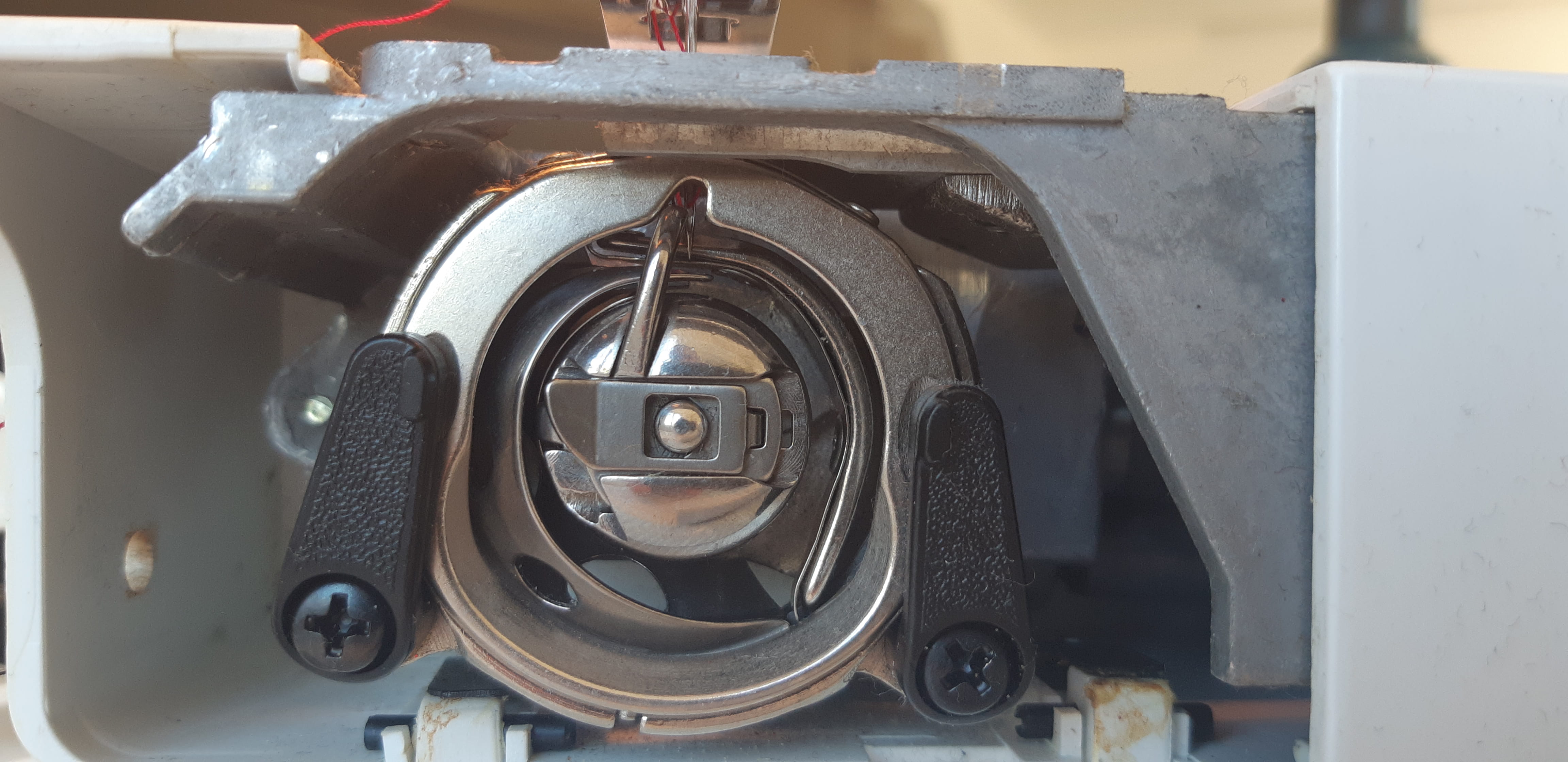 Mettre l'aiguille au point le plus bas et basculer les deux leviers noires et enveler la tôle devant que je puisse voir comment est positionné la navette.
